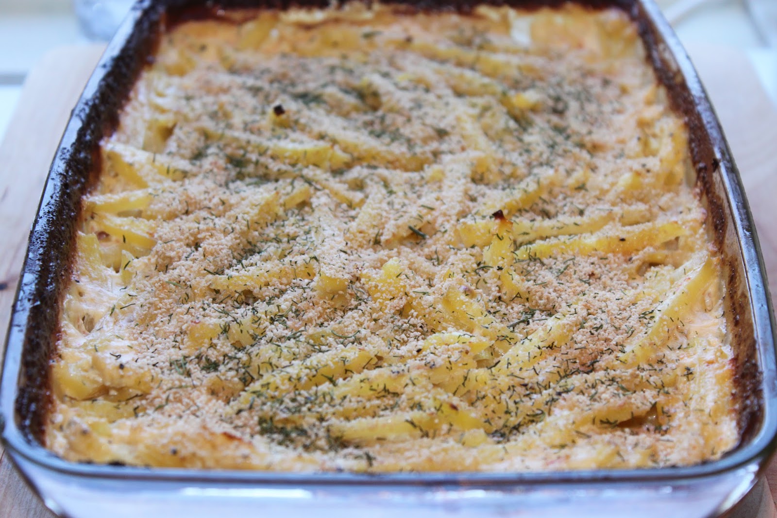 Värm upp ugnen på 200 C och smörj en ugnsfast form, à ca 2 liter, med lite matfett. Skala potatisen och skär den i tunna strimlor. Lägg den i formen och blanda ner purjolöken, saltet och svartpepparn. Vispa ihop grädden med kaviaren. Häll detta i formen. Täck formen med aluminiumfolie. Sätt in formen i den nedre delen av ugnen och grädda i ca 1 - 1 ½ timme, eller tills potatisen är mjuk. Ta ut formen ur ugnen och ta bort folien. Ha på ströbrödet. Sätt tillbaka formen i ugnen men sätt in den högre upp. Höj värmen till 225 C och grädda gratängen i ytterligare ca 10 minuter, eller tills ströbrödet fått lite färg.
